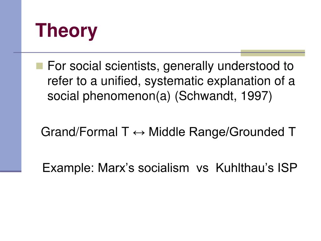 In the middle range, or substantive theory [16], differ considerably from grand or formal theories. The first is positive, and describes what such theories should do: These concepts are often used to define the approach that nurses should take when caring for their patients.