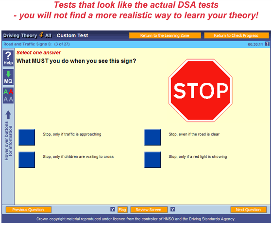 Look down the page for all sections for the car, motorcycle, lgv or pcv theory test. A multiple choice quiz much like the one you can practise here, plus a hazard perception test. If you're unsure what the procedure is for answering questions, don't worry.